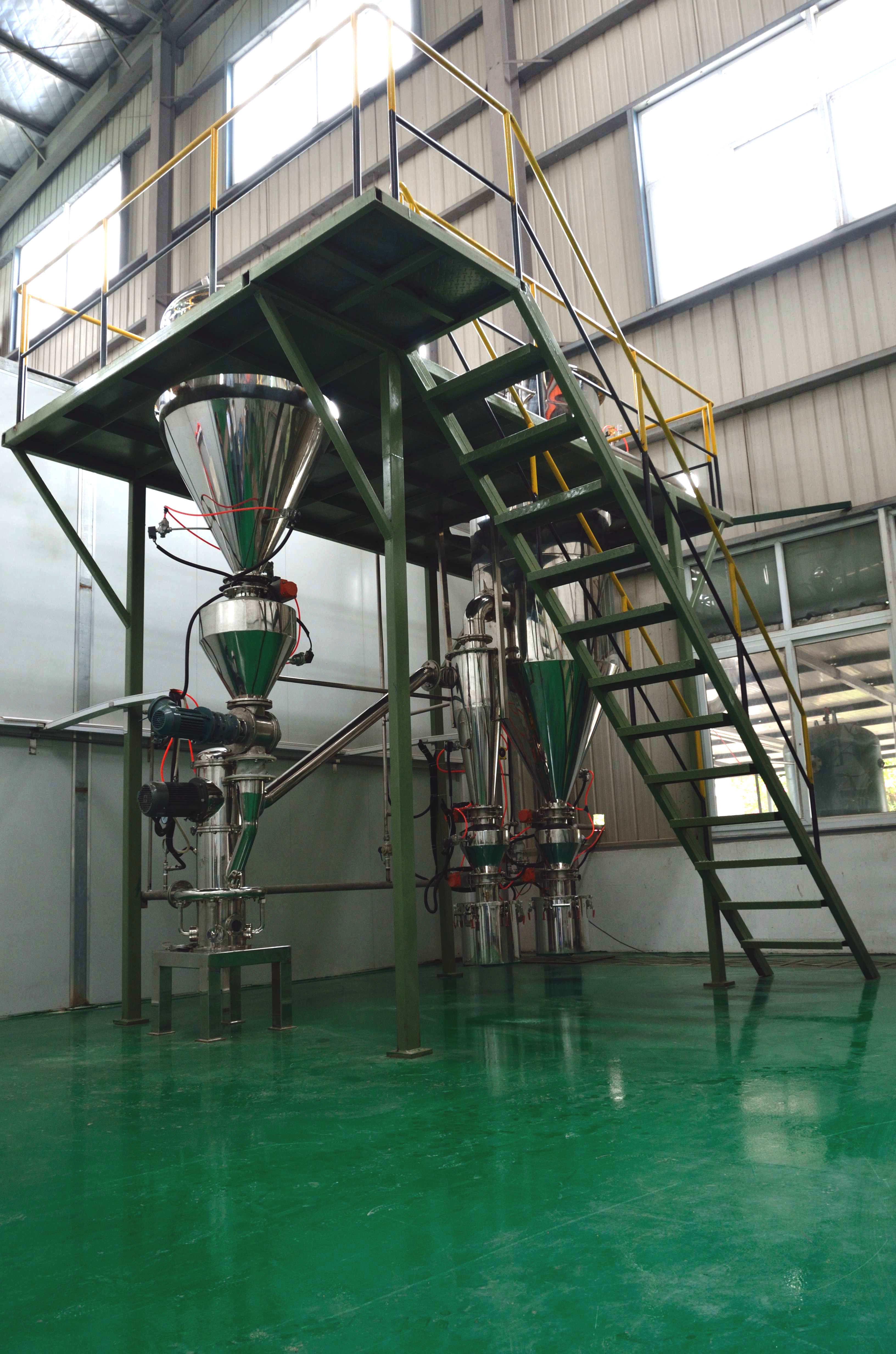 惰性氣體保護(hù)生產(chǎn)線(如氮?dú)?、氦氣、二氧化碳等)整套系統(tǒng)在惰性氣體保護(hù)下實(shí)現(xiàn)粉碎、分級(jí),閉環(huán)運(yùn)行。通過(guò)改變氣源成分,增加相關(guān)附配設(shè)備,優(yōu)化密封工藝,為易燃、易爆、易氧化或極易吸潮物料設(shè)計(jì)定制的粉體加工生產(chǎn)線??筛鶕?jù)物料的不同更換環(huán)境氣體,系統(tǒng)采用先進(jìn)的觸摸屏,可編程序PLC控制器,實(shí)現(xiàn)了全自動(dòng)控制。氧含量控制容易簡(jiǎn)單,但其循環(huán)使用消耗極小,純度的誤差可控制在1PPM,含量可任意設(shè)定。惰性氣體保護(hù)粉碎系統(tǒng)是采用惰性氣體作為超微粉碎實(shí)現(xiàn)干式物料的超細(xì)粉碎。該系統(tǒng)主要由壓縮機(jī)、儲(chǔ)氣罐、料倉(cāng)、粉碎主機(jī)、旋風(fēng)分離器、捕集器、自動(dòng)化控制柜等組成。系統(tǒng)開(kāi)機(jī)時(shí)首先用惰性氣體不斷充入系統(tǒng)中將空氣惰化,直至全系統(tǒng)達(dá)到氧探測(cè)儀設(shè)定的數(shù)值,然后自動(dòng)啟動(dòng)加料裝置將料倉(cāng)中的原料均勻加入粉碎主機(jī)的粉碎室,經(jīng)壓縮的情性氣體通過(guò)特殊配置的超音速噴嘴向粉碎室高速噴射,物料通過(guò)投料口進(jìn)入柱形粉碎室,被沿著研磨軌做圓周運(yùn)動(dòng)的研磨輪碾壓、剪切而實(shí)現(xiàn)粉碎。被粉碎的物料隨上升氣流進(jìn)入分級(jí)室,進(jìn)不了分級(jí)輪返回粉碎室繼續(xù)沖擊粉碎,滿足要求的細(xì)粒子進(jìn)入分級(jí)輪隨氣流被旋風(fēng)分離器除塵器收集,惰性氣體返回壓縮機(jī)吸氣口,通過(guò)壓縮機(jī)作用,使其氣體壓縮循環(huán)使用。